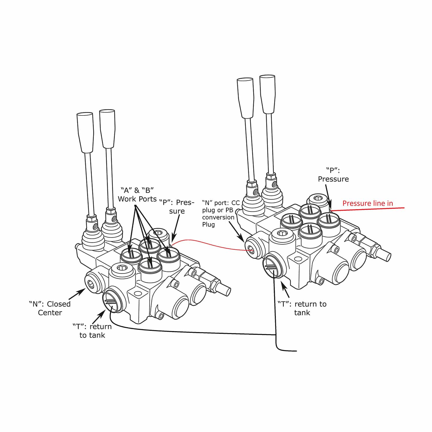 These Hydraulic Control Valves can be used to operate any hydraulic cylinders (“A” Spool) or hydraulic motors (“D” spool) using levers or cables. These valves have Max. allowed flows of either 11 GPM or 21 GPM. In addition, they have (1) inlet port and (1) low-pressure tank port, (1) optional power-beyond port. These valves can be converted for use on closed-center hydraulic systems (adapter required).