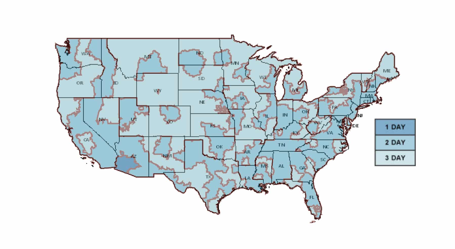 If your order ships via USPS Priority Mail (Orders over 1lb and less than 20lbs), you can use the map below to estimate shipping times.