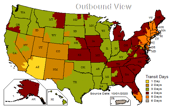 If shipping via UPS Ground (Orders over 20 lbs), then you can use the map below to estimate your shipping time.