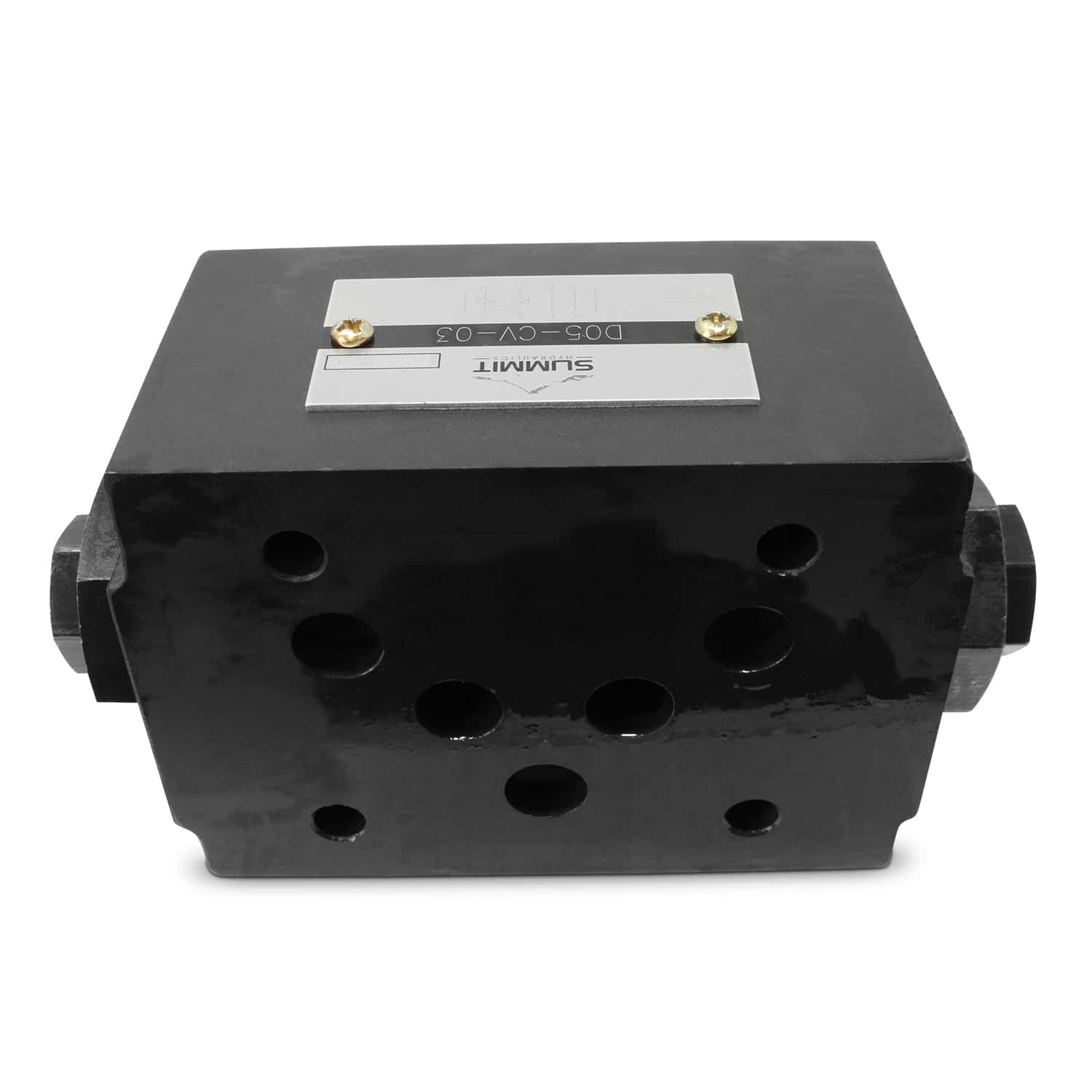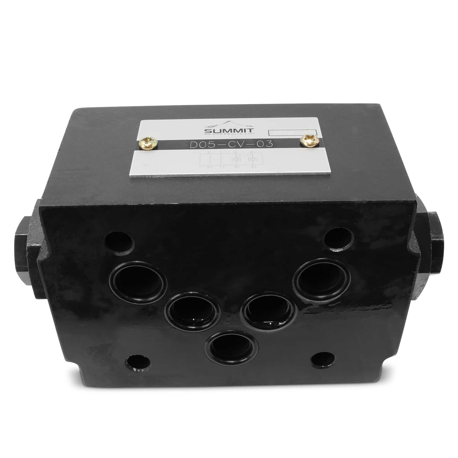 This double pilot operated check valve is designed to hold hydraulic cylinders and prevent them from drifting down while your directional control valve is in the neutral position. Utilizing 4 additional socket head cap screws, this double pilot operated check valve will be sandwiched in between the D05 valves and manifold.