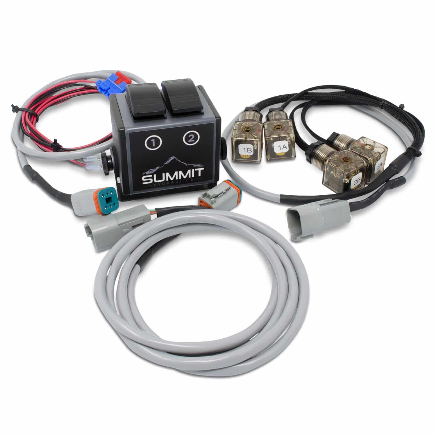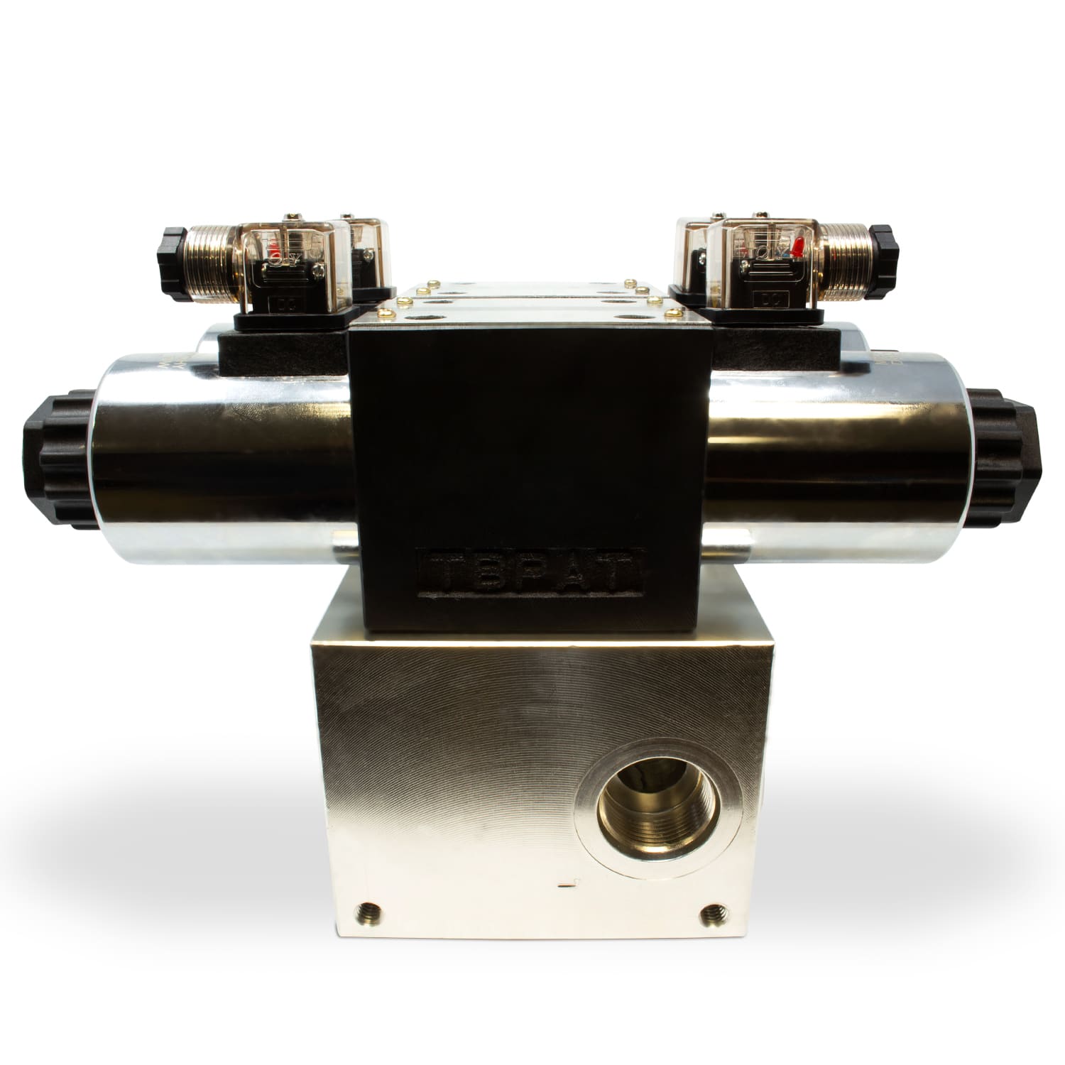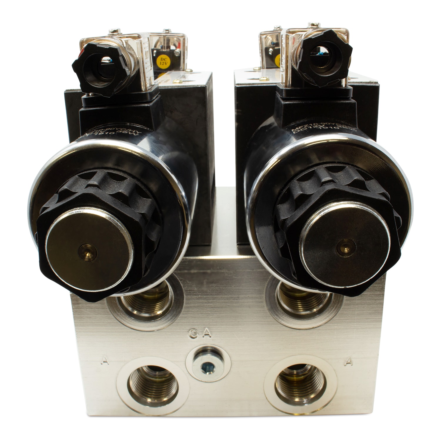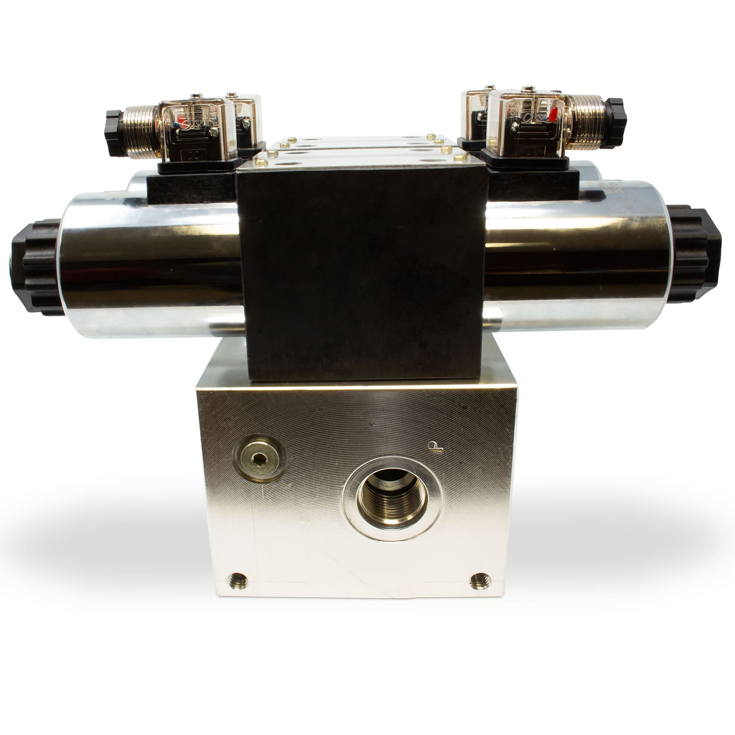 An Electric Hydraulic Double Acting Directional Control Valve, 2 Spool, 25 GPM controls the flow of hydraulic fluid in/out of a hydraulic cylinder or motor,