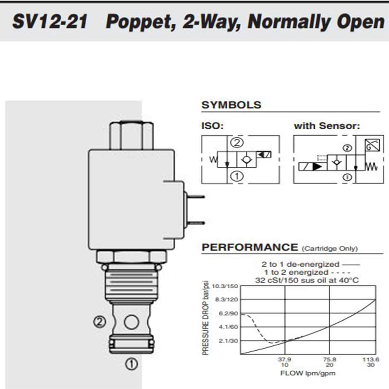 When de-energized, the SV12-21 allows flow from 2 to 1, while flow from 1 to 2 is severely restricted.