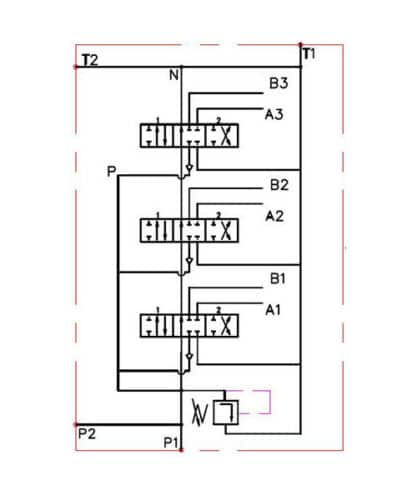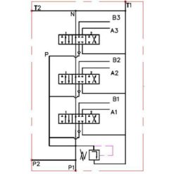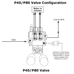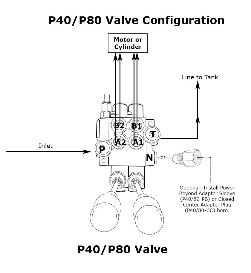 This valve has a pressure line (Inlet), tank line (outlet), work ports (A/B ports that go to hydraulic cylinder or motor), and optional power beyond port (N Port, used to connect valves downstream). Some common examples of connecting this valve below, however it is possible to connect it in different configurations than shown.