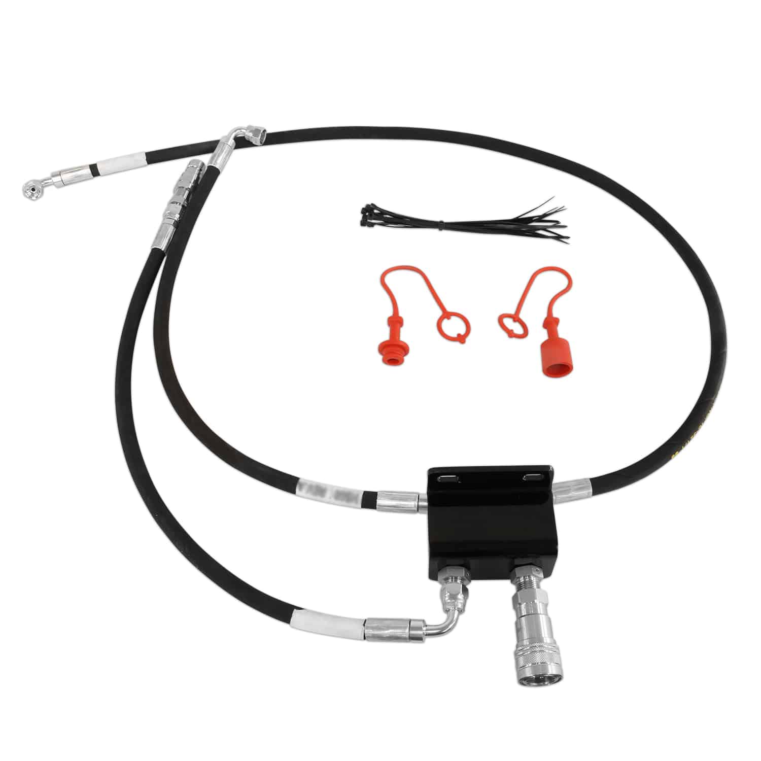Pre routed hoses from the pressure port and return to tank port are included. All quick disconnect couplers are routed to the rear of the tractor. Then, your rear attachment can be easily connected to a control valve plumbed to the power beyond port. Because of this design, you will not have buy longer hoses and you get a more economical alternative to OEM parts.