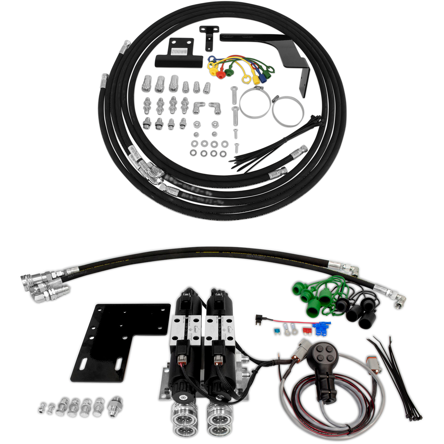 This all-in-one rear remote valve kit with front 3rd function is designed to install on your John Deere 2032R, 2038R Series Tractor (with power beyond kit installed) to add rear remote connections and a third function. This allows you to easily control various hydraulic implements in the front and rear using our Summit Hydraulics joystick and/or switchbox controls. You can add two, three, or four rear remote coupler sets to your machine and a third function in the front.